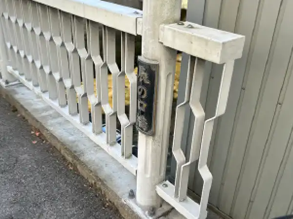 欄干が銀色に輝いくパイプを組み合わせた